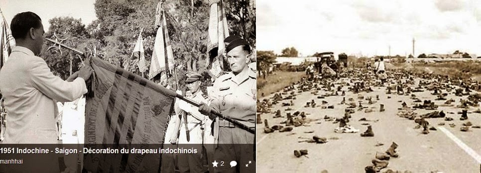 Hình trái: Sĩ quan của thực dân Pháp cầm lá cờ vàng ba sọc đỏ để nhận huy chương của chính phủ Trần Văn Hữu thời Pháp thuộc.(Hình của manhhai)